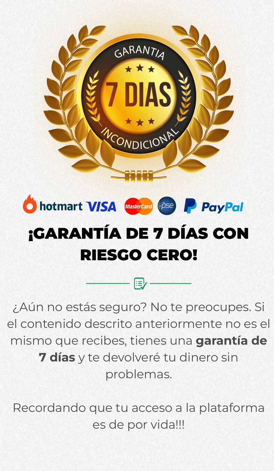 Tienes 7 días para probar el curso y todos los recursos. Si no te aporta valor, puedes pedir la devolución del 100 % de tu dinero. Sin preguntas.